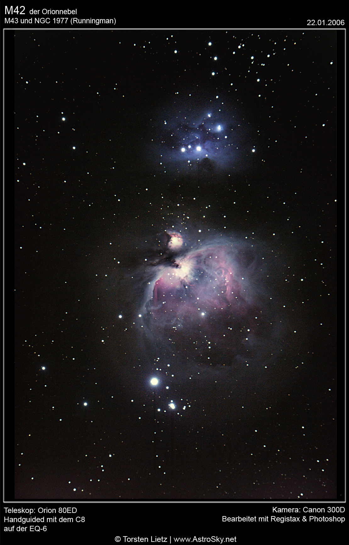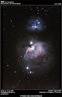 Hambergen den 22.01.2006 M42, M43 und NCG1977 aufgenommen mit dem Orion 80ED und der Canon 300D. Aufgenommen würden 3x 10sek / 3x30sek / 3x180sek / 3x240sek alle bei ISO800. Die Bilder wurden dann mit Registax gestack, und mit Photoshop weiterverarbeitet. Hier noch 3 weitere Versionen dieses Bildes. Version 2 / Version3 / Version4 Das rechten Bild ist aus den gleichen Bilddaten entstanden wie das linke. Nur die Bearbeitungsweise hat sich geändert. (17.01.09)
