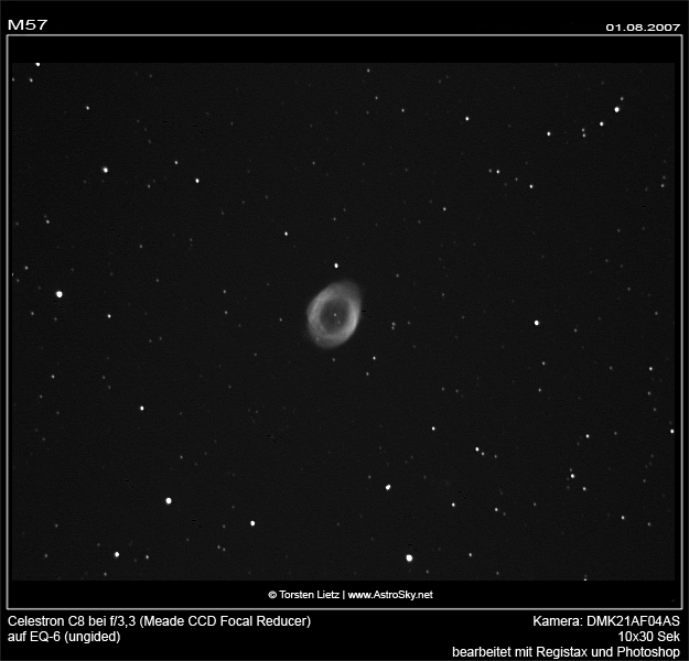 Dieser M57 ist das erste Deesky Objekt, das ich mit der DMK21AF04AS Firewire Kamera aufgenommen habe. Dafür das ich kein Deepsky Experte bin, weil ich Planeten bisher einfach mehr gereizt haben, war ich recht erstaunt, wie einfach es war, ein solches Ergebniss zu erzielen. Die DMK21AF würde zusammen mit einem f/3,3 Focal Reducer an ein C8 geklemmt, und los ging´s. 15 Aufnahmen a 30sek und und das ganze UNGUIDED. Einige Aufnahmen waren misslungen, und so würde dann 10 Fotos gestackt mit Registax und etwas mit Photoshop feingeschliffen. Würde man besser einnorden, und vielleicht noch einen Autoguider einsetzt, kann man mit dieser Kamera sicherlich viel Spaß haben. |